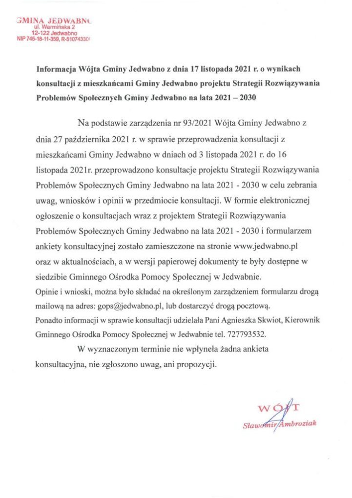 Gminni urzędnicy zwrócili się do mieszkańców o opinie dotyczące projektu Strategii Rozwiązywania Problemów Społecznych Gminy Jedwabno na lata 2021-2030. W wyznaczonym terminie nie wpłynęła do urzędu żadna ankieta konsultacyjna. Nie zgłoszono też uwag i opinii.
