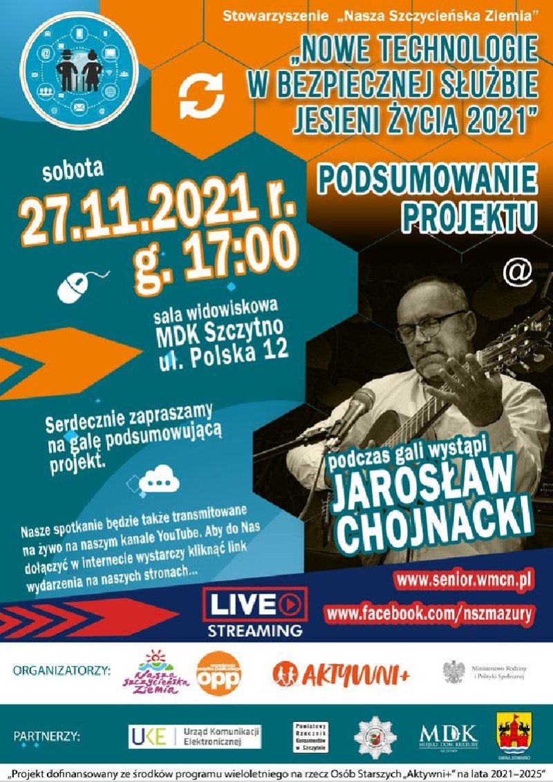 Zapraszamy na galę podsumowującą projekt "Nowe technologie w bezpiecznej służbie jesieni życia 2021", która odbędzie się w sobotę 27 listopada o godz. 17:00 w sali widowiskowej Miejskiego Domu Kultury w Szczytnie. Spotkanie uświetni swoim występem JAROSŁAW CHOJNACKI.