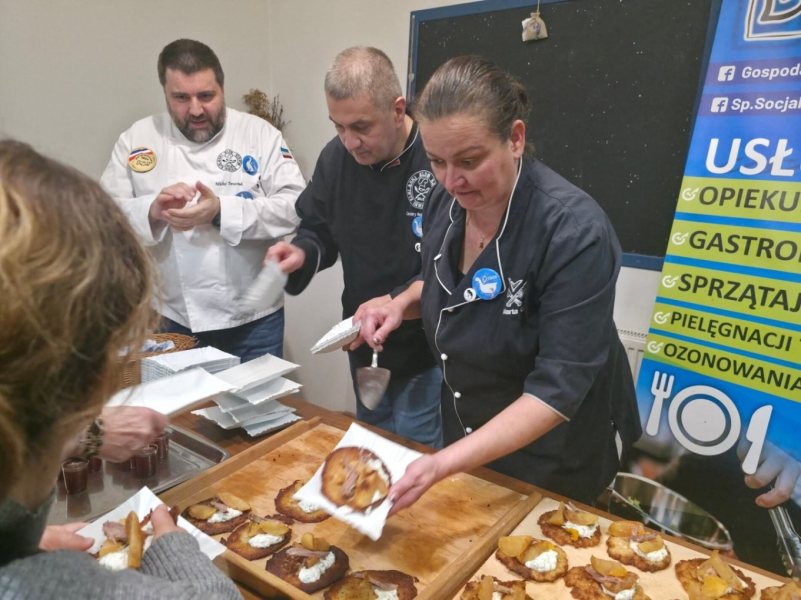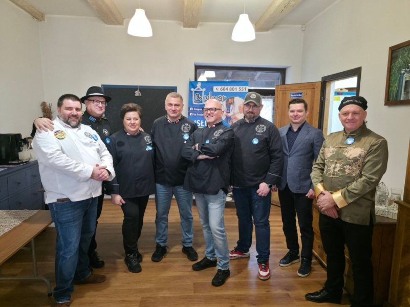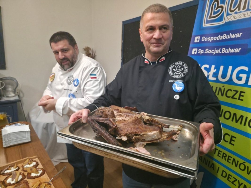 Mistrzowie pospołu zaserwowali kocioł zupy z prośnianek czyli rosołu z gąsek zielonych, na gęsinie - oczywiście, a później - indywidualnie - kilka dań dowodząc, że choć podstawa jednaka: gęsina i ziemniaki, to twórcza wyobraźnia kucharska może zdziałać cuda.