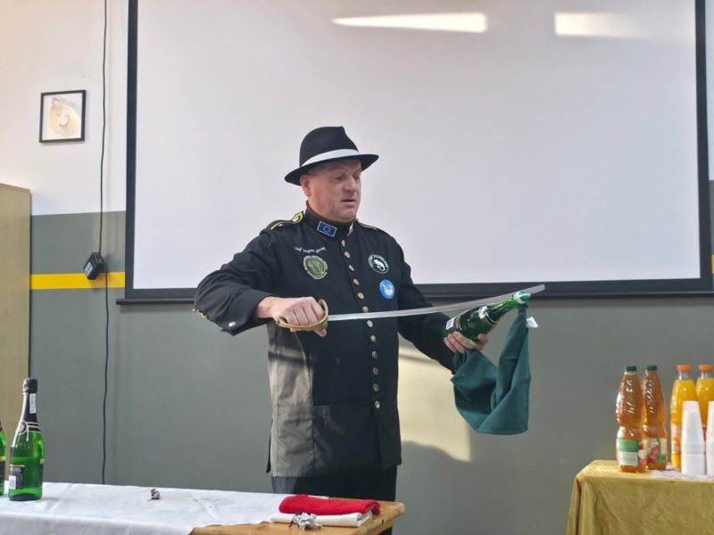 A że nie samym jadłem (i napitkiem) człek żyje, w Jerutkach nie zabrakło też pokazów i pogadanek o różnej lecz co najmniej zbliżonej do kulinarnej tematyce i różnej… trudności. Bo też i niełatwą dla śmiałków z grona widzów okazała się sztuka otwierania szampana… szablą.