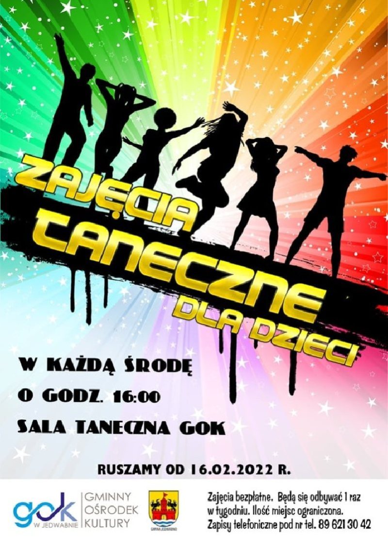 W Gminnym Ośrodku Kultury w Jedwabnie ruszyły zapisy na zajęcia taneczne. - Zapraszamy wszystkie chętne dzieci – zachęca Adam Cudak, dyrektor placówki. - Zajęcia są bezpłatne – dodaje. Będą odbywały się one raz w tygodniu. Zapisy przyjmujemy pod nr tel. 89 621 30 42. Szczegóły na plakacie.