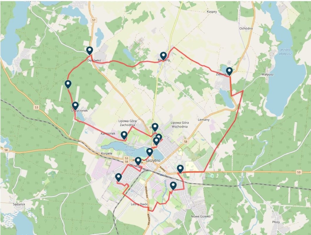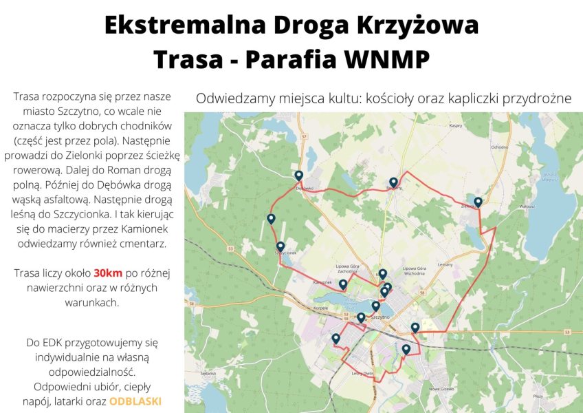 Zaplanowaną trasę możemy już dziś zobaczyć dzięki aplikacji. Tam też znajdziemy miejsca stacji Drogi Krzyżowej. Zachęcamy, aby zapoznać się z nią, a może nawet przed wyjściem przejechać samochodem, czy rowerem w celu przygotowania: https://www.traseo.pl/trasa/edk-szczytno