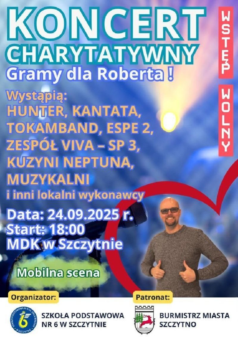 W środę, 24 września, w Miejskim Domu Kultury w Szczytnie odbędzie się koncert, którego nikt nie traktuje jak zwykłego występu. Hasło jest proste: „Gramy dla Roberta”. Początek o godzinie 18:00, wstęp wolny.