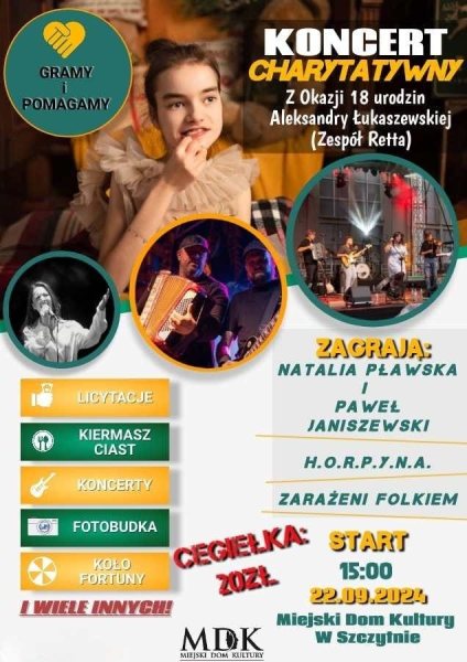 W niedzielę, 22 września w Miejskim Domu Kultury w Szczytnie odbędzie się koncert charytatywny z okazji 18. urodzin Aleksandry Łukaszewskiej, cierpiącej na Zespół Retta. Wydarzenie „Gramy i Pomagamy” to świetna okazja, by wesprzeć Aleksandrę oraz wziąć udział w wielu atrakcjach przygotowanych przez organizatorów.
