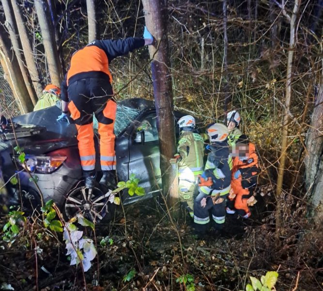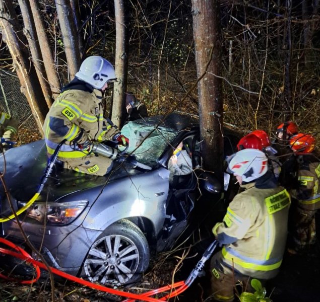 Strażacy musieli użyć specjalistycznego sprzętu, aby dostać się do poszkodowanego i wydobyć go z samochodu. Na miejscu pracują wszystkie służby ratunkowe, zabezpieczając teren i udzielając pomocy medycznej.
