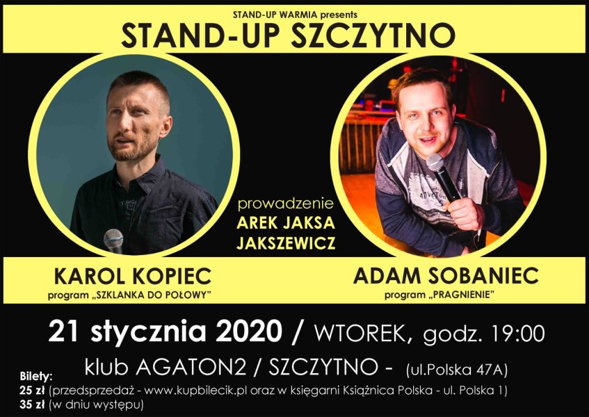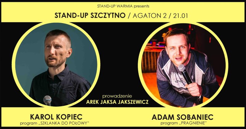 We wtorek, 21 stycznia Szczytno odwidzą gwiazdy polskiego stand-up, które związane są między innymi z telewizyjną Comedy Central. Karol Kopiec i Adam Sobaniec wystąpią w szczycieńskim klubie Agaton 2. Początek godz. 19. Bilety na to wydarzenie wciąż są dostępne. Będzie można je też kupić tuż przed występem komików. Polecamy.