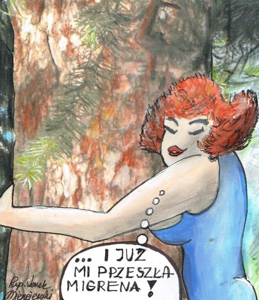 On łagodzi napięcia i poprawia mi humor. Potrafi oczyścić mi organizm z bólu i zasilić chęcią do życia. Za chwilę, gdy wpadnę do lasu, przytulę się do pnia buku, a liść z tego drzewa przyłożę na czoło, natychmiast złagodzi ból głowy. Zapomnę o gderaniu mojej żony i o pretensjach zarządu. Z pośpiechem wskoczyłem do samochodu i ruszyłem przez zatłoczone ulice miasta. Tłok i korki niczym w centrum Warszawy. Powariowali. Rozkopali połowę arterii, remontują ulice w mieście i na dodatek kładą nowe chodniki.