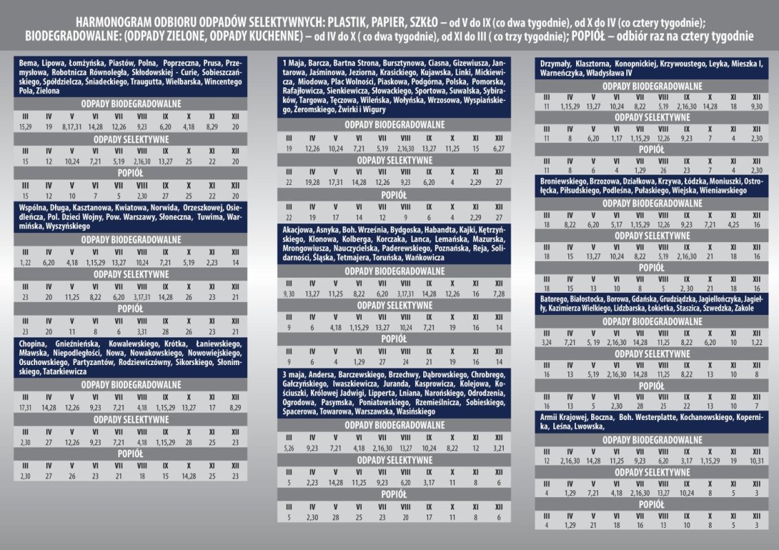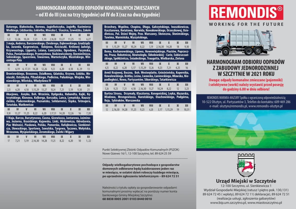 Harmonogram odbioru odpadów komunalnych z zabudowy jednorodzinnej w Szczytnie do końca 2021 roku. Plik można pobrać stąd <<kliknij>>