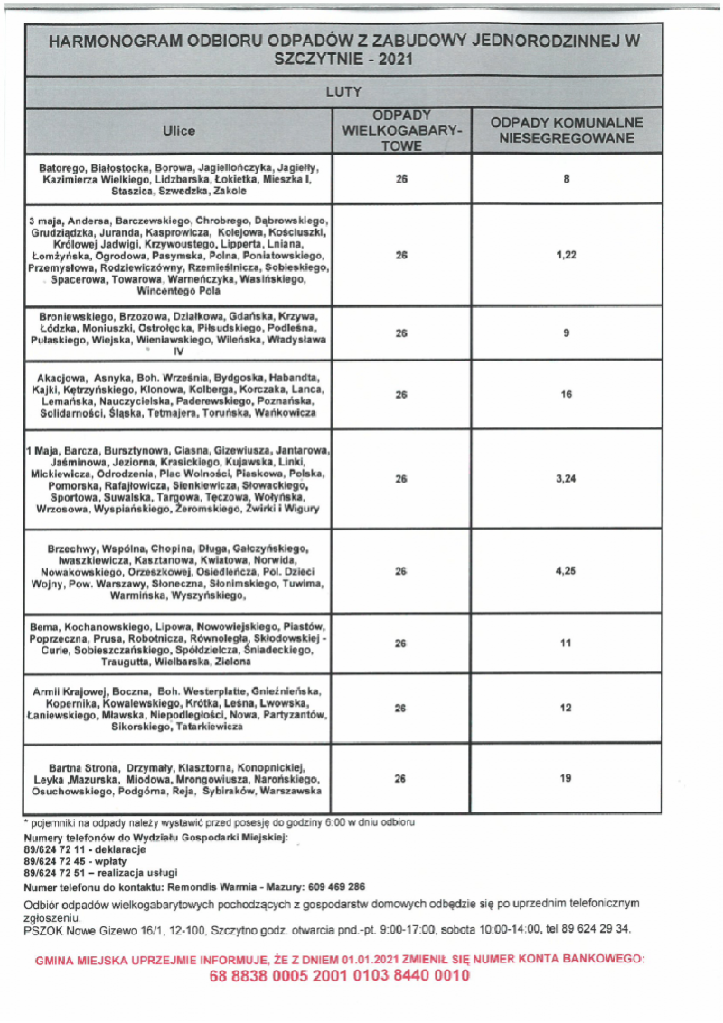 Harmonogram odbioru odpadów z zabudowy jednorodzinnej w Szczytnie 2021 roku, znajdziecie Państwo tu: kliknij <<tutaj>>