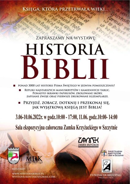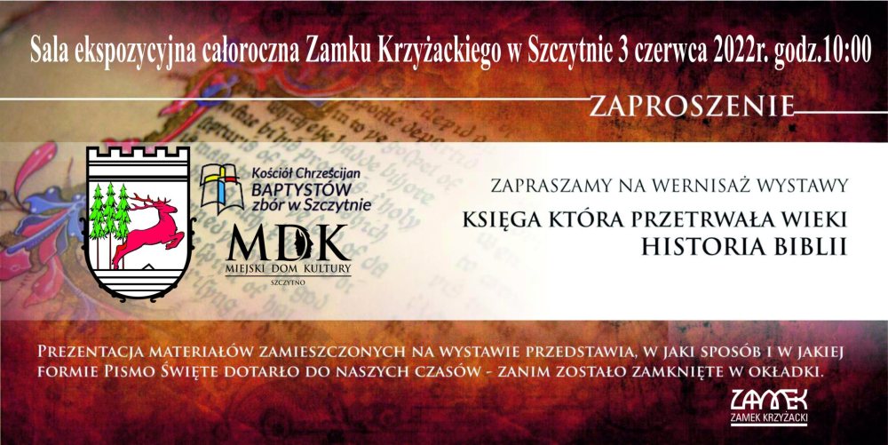 Jestem wdzięczny kierownictwu Miejskiego Domu Kultury oraz władzom miasta za poparcie inicjatywy Zboru Kościoła Chrześcijan Baptystów w Szczytnie i udostępnienie zamkowej sali ekspozycyjnej na to wydarzenie, które odbędzie się w ramach cyklu przedsięwzięć związanych z obchodami 110-lecia istnienia zboru baptystycznego w Szczytnie. A ponieważ Pismo Święte jest niekwestionowanym dobrem wszystkich chrześcijan, więc warto będzie spotkać się na tej wystawie i bliżej poznać Biblię oraz jej ciekawą historię. Szczególnie zachęcamy nauczycieli i młodzież szkolną, która będzie zwiedzać nasz szczycieński Zamek, bo przy okazji będzie miała okazję na bliższe poznanie historii tej księgi, o której uczy się zresztą również na lekcjach języka polskiego.