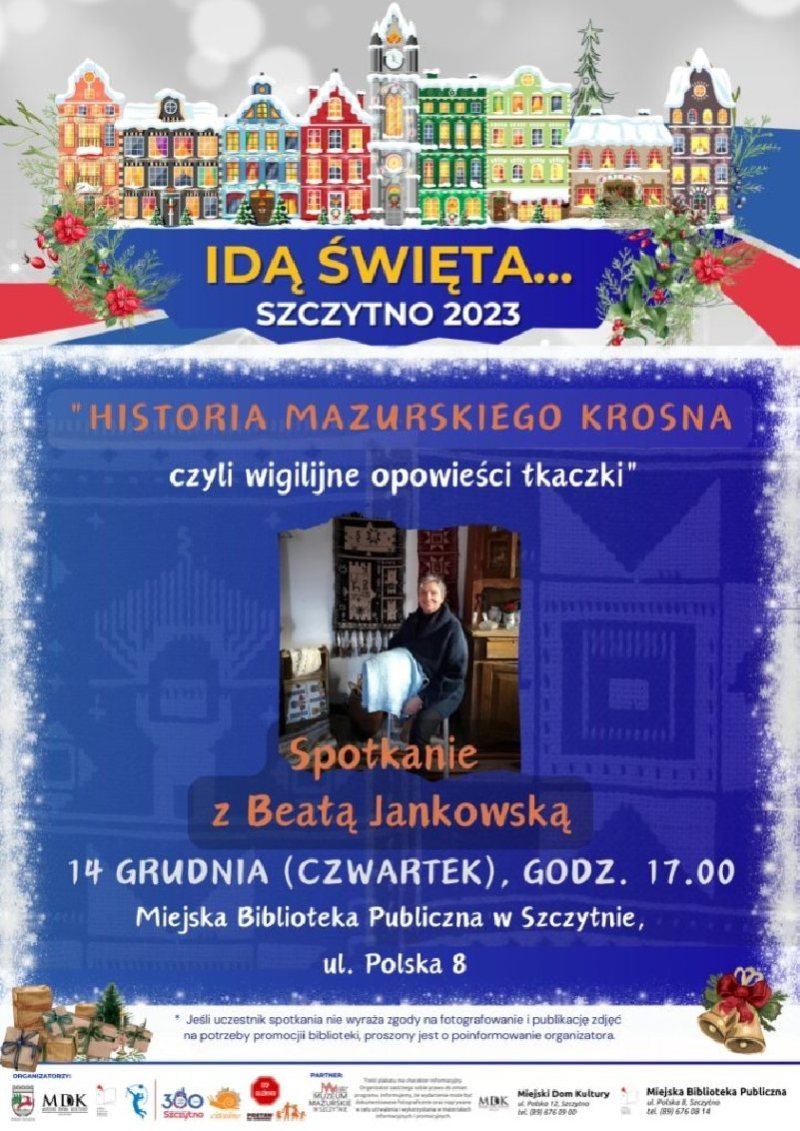 W czwartek, 14 grudnia w ramach miejskiej akcji "Idą Święta... Szczytno 2023", Beata Jankowska zabierze nas w podróż przez historię mazurskiego krosna. Wydarzenie "Historia mazurskiego krosna, czyli wigilijne opowieści tkaczki" odbędzie się o godzinie 17 w Miejskiej Bibliotece Publicznej w Szczytnie.