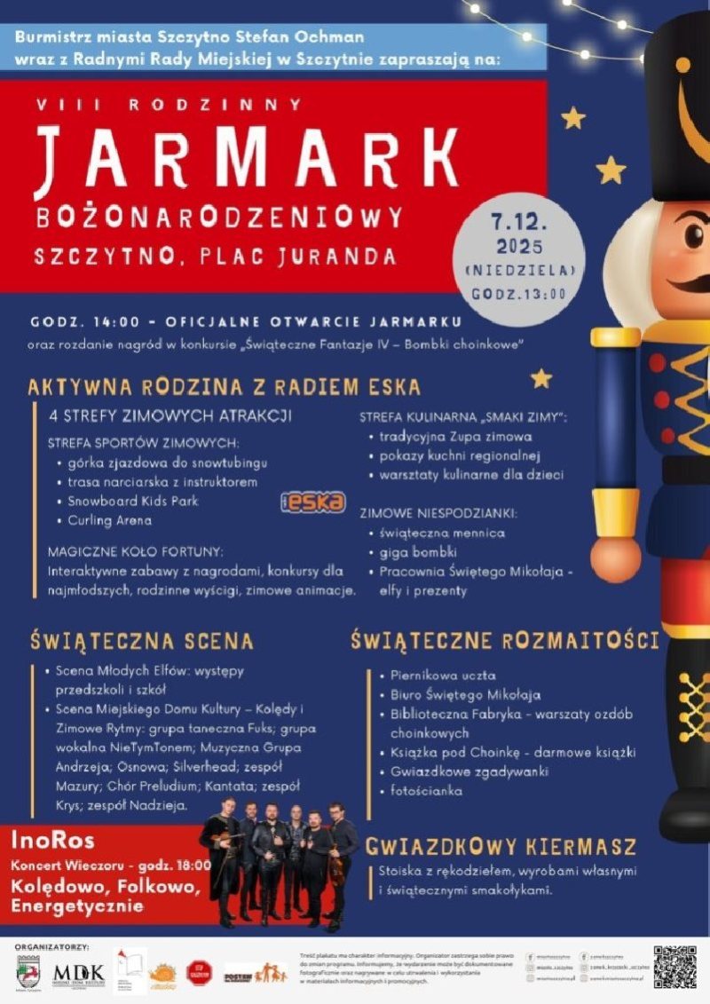 W niedzielę, 7 grudnia, na Placu Juranda ruszy VIII Rodzinny Jarmark Bożonarodzeniowy w Szczytnie. Atrakcje rozpoczną się o godz. 13:00, a oficjalne otwarcie zaplanowano na 14:00.