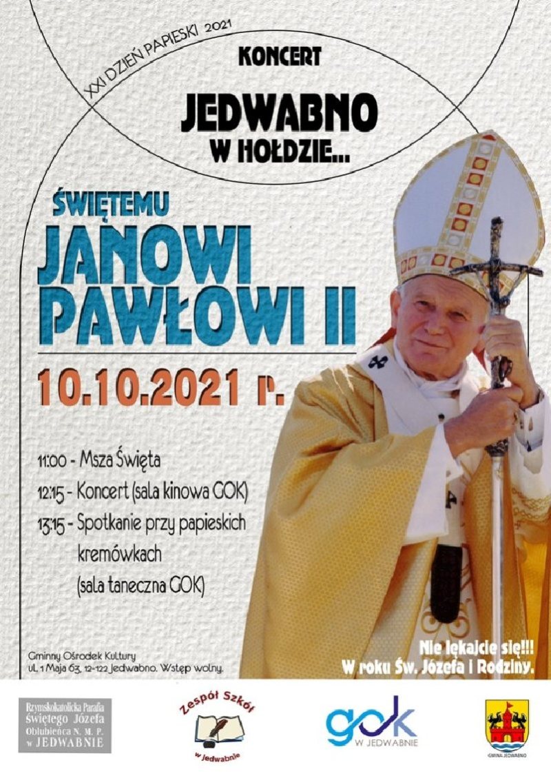Na niedzielę, 10 października zaplanowano w Jedwabnie uroczyste obchody XXI Dnia Papieskiego 2021 - Jedwabno w hołdzie Janowi Pawłowi II. Szczegóły na plakacie!