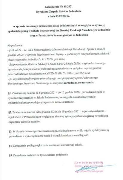 Zgodnie z zarządzeniem 49/2021 Dyrektora Zespołu Szkół w Jedwabnie zamknięcie placówek potrwa od 6 do 10 grudnia 2021 roku. Uczniowie przechodzą więc w tryb nauczania zdalnego.