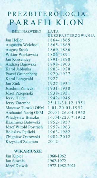 Przez 150 lat istnienia posługę duszpasterską w parafii pełniło wielu kapłanów. Ksiądz Krzysztof jest już 22. proboszczem w Klonie. Objął swoją funkcję w 2012 roku. Zastąpił ks. Zbigniewa Ostrowskiego, który kierował tą parafią najdłużej, bo 30 lat. Przed nim, przez 19 lat, proboszczem był Bolesław Pętlicki i warto przypomnieć, że wtedy jeszcze parafia w Klonie obejmowała także Rozogi, które odrębną parafią nie były. Historia parafii w Klonie dowodzi, że każdy kolejny proboszcz pełnił swą posługę dłużej od poprzednika. Jeśli ten trend się utrzyma, przed księdzem Krzysztofem jeszcze wiele lat pracy na rzecz klonowskiej społeczności.