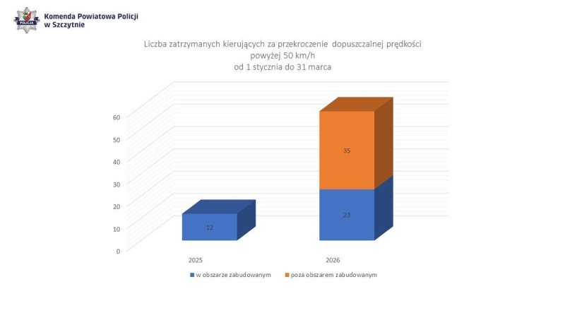 W okresie od 1 stycznia do 31 marca 2025 roku funkcjonariusze zatrzymali 12 kierujących, którzy przekroczyli dozwoloną prędkość o ponad 50 km/h w obszarze zabudowanym. W analogicznym okresie 2026 roku liczba ta wzrosła niemal dwukrotnie, policjanci ujawnili 23 takie przypadki w obszarze zabudowanym oraz dodatkowo 35 przekroczeń tej wartości poza obszarem zabudowanym.
