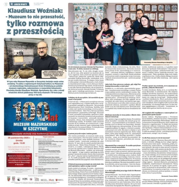 To symbol ciągłości. Muzeum Mazurskie jest jak lustro, w którym odbijają się losy całego regionu. Przeszło przez różne epoki – niemiecką, polską, komunistyczną, wolnorynkową – i w każdej zachowało sens istnienia. Dla mnie to także dowód, że historia potrafi być mądra, jeśli umiemy jej słuchać. Bo muzeum to nie tylko miejsce przeszłości. To rozmowa – o tym, kim byliśmy, kim jesteśmy i dokąd zmierzamy. I mam nadzieję, że ta rozmowa potrwa kolejne sto lat. To nie tylko jubileusz instytucji, ale historia ludzi, którzy przez sto lat pielęgnowali pamięć tej ziemi. W tym jednym miejscu skupiły się losy całego regionu – dawnych Mazurów, powojennych osadników, współczesnych mieszkańców. Naszą misją jest, by ta pamięć nie zgasła. Często powtarzam, że muzeum to nie przeszłość, tylko rozmowa z przeszłością. I ta rozmowa wciąż trwa – w murach ratusza, na wystawach, podczas spotkań, w oczach ludzi, którzy tu przychodzą.