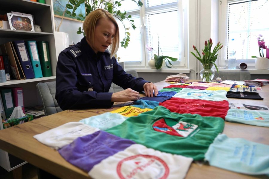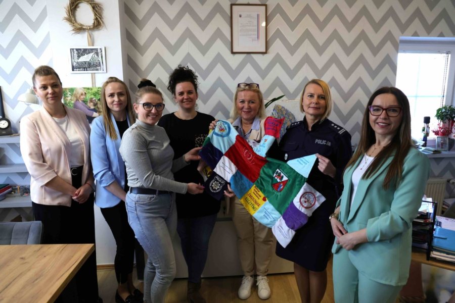 4 kwietnia do akcji dołączyła również Akademia Policji. Insp. dr Agata Malasińska-Nagórny przekazała naszywkę Akademii i własnoręcznie przyszyła ją do wspólnego pledowego dzieła.
