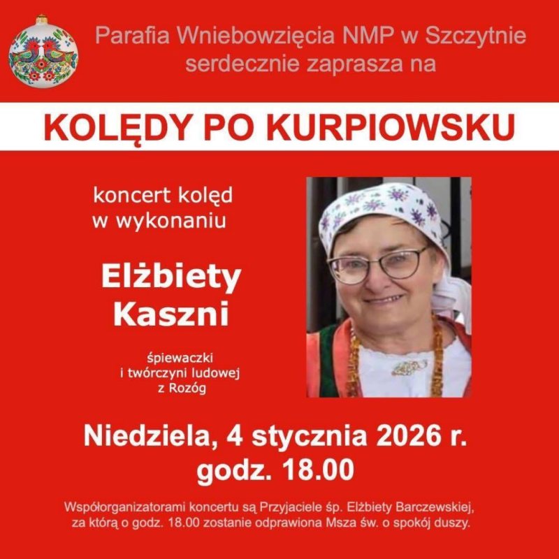 Parafia Wniebowzięcia Najświętszej Maryi Panny w Szczytnie zaprasza na koncert kolęd w wykonaniu Elżbiety Kaszni – śpiewaczki i twórczyni ludowej z Rozóg. Wydarzenie odbędzie się w niedzielę, 4 stycznia 2026 roku o godz. 18.00.