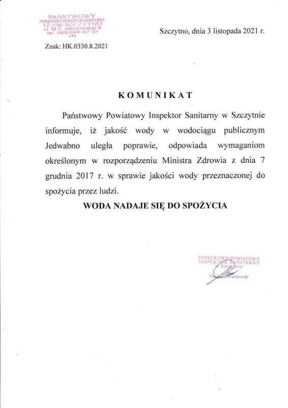 Państwowy Powiatowy Inspektor Sanitarny w Szczytnie informuje, iż jakość wody w wodociągu publicznym Jedwabno uległa poprawie, odpowiada wymaganiom określonym w rozporządzeniu Ministra Zdrowia z dnia 7 grudnia 2017 r. w sprawie jakości wody przeznaczonej do spożycia przez ludzi.