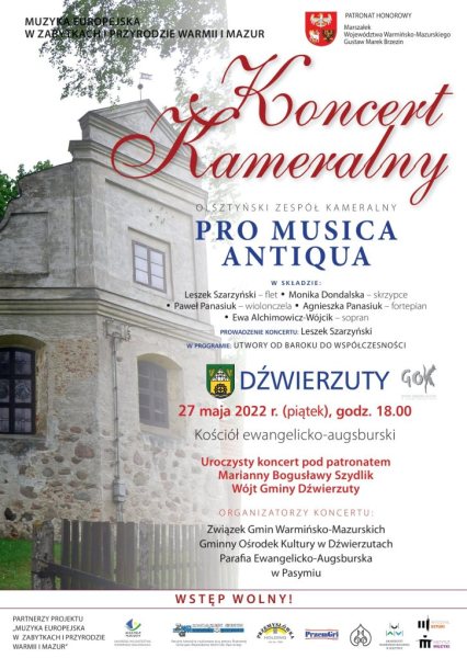 W piątek, 27 maja w kościele ewangelicko-augsburskiej w Dźwierzutach odbędzie się kameralny koncert Pro Musica Antiqua. Początek koncertu godz. 18. Wstęp wolny. Wydarzenie organizuje Gminny Ośrodek Kultury w Dźwierzutach.
