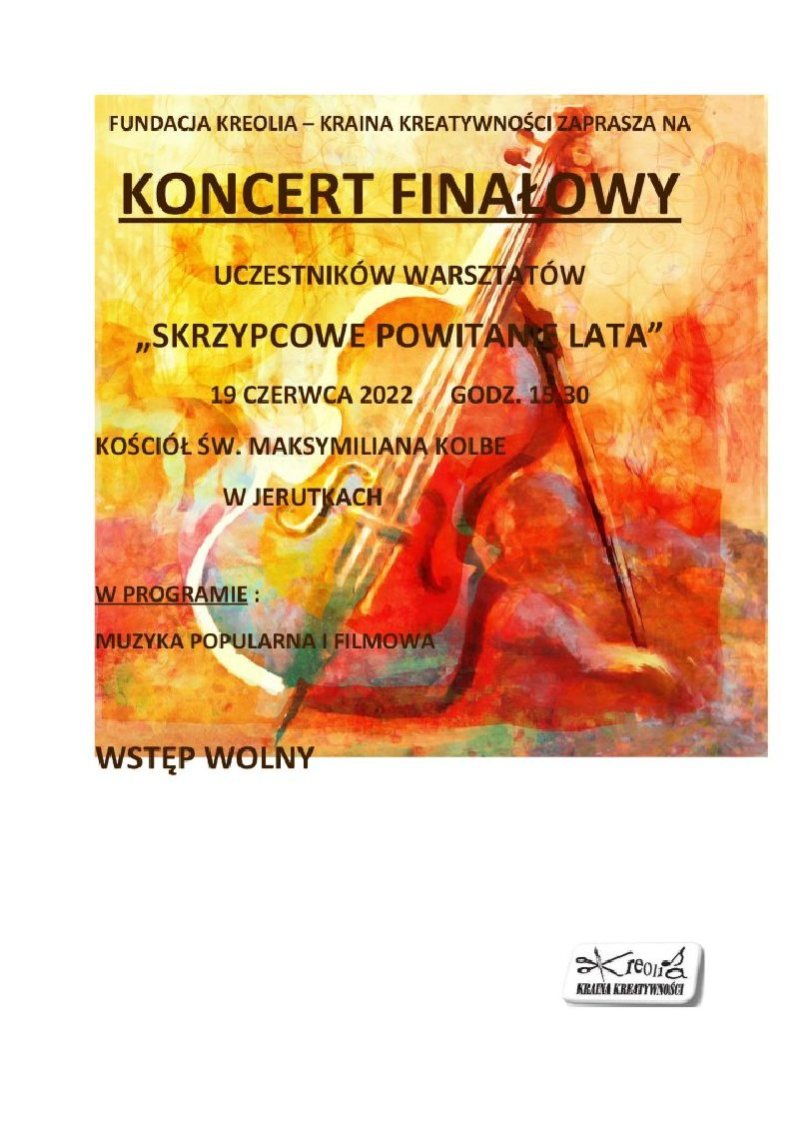 Serdecznie zapraszamy do wzięcia udziału w warsztatach „Skrzypcowe powitanie lata”, którego organizatorem jest Fundacja na Rzecz Wspierania Rozwoju Kreatywności oraz Rozwoju Twórczości Dzieci, Młodzieży i Dorosłych „Kreolia-Kraina Kreatywności”. Koncert finałowy organizowany w ramach warsztatów odbędzie się w niedzielę, 19 czerwca o godz. 15:30 w Kościele w Jerutkach. Wstęp wolny.