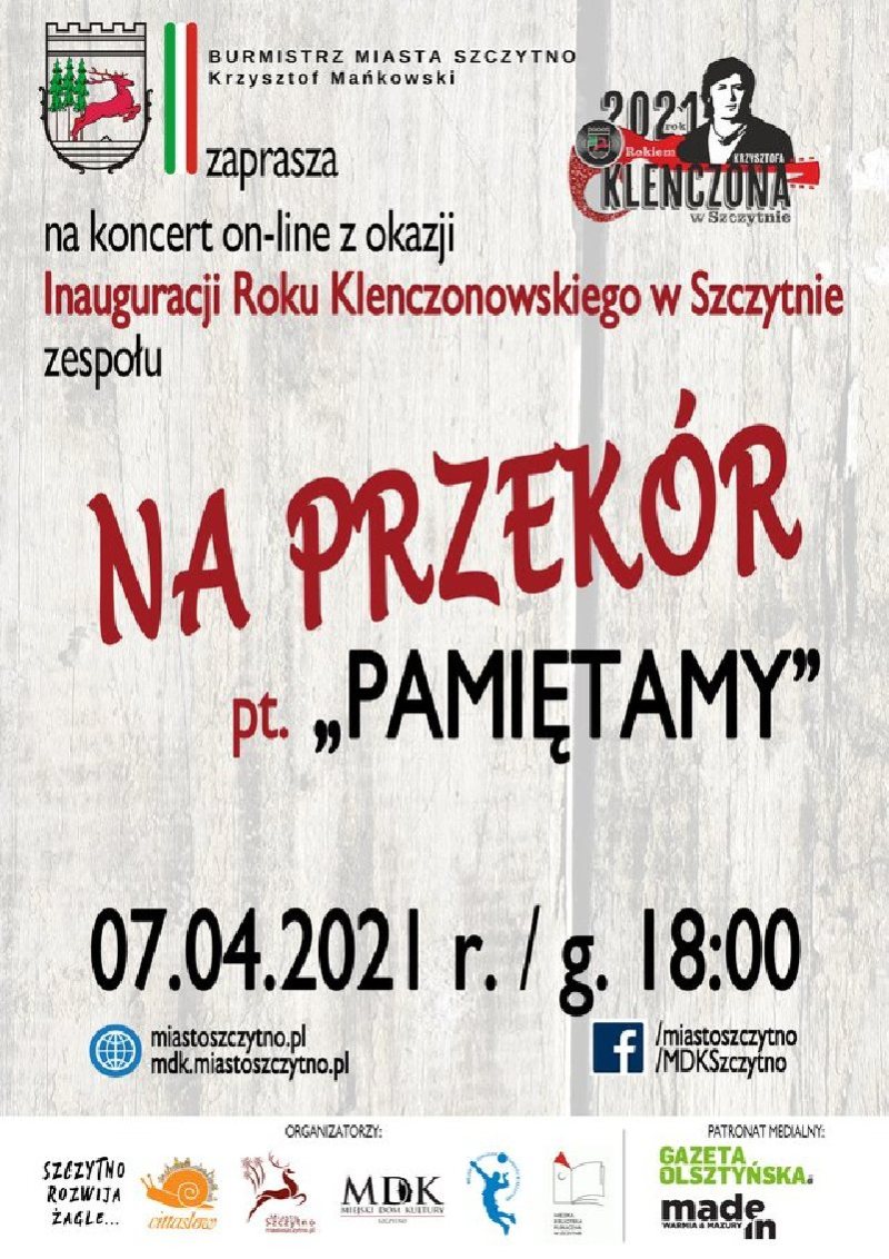 W środę, 7 kwietnia odbędzie się koncert online zespołu „Na przekór”. Występ będzie poświęcony Krzysztofowi Klenczonowi. Koncert to element obchodów Roku Klenczonowskiego w Szczytnie. Początek transmisji godzina 18. Koncert można obejrzeć na stronach i profilach FB Urzędu Miasta Szczytno oraz MDK Szczytno.
