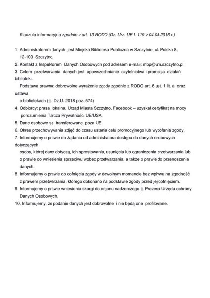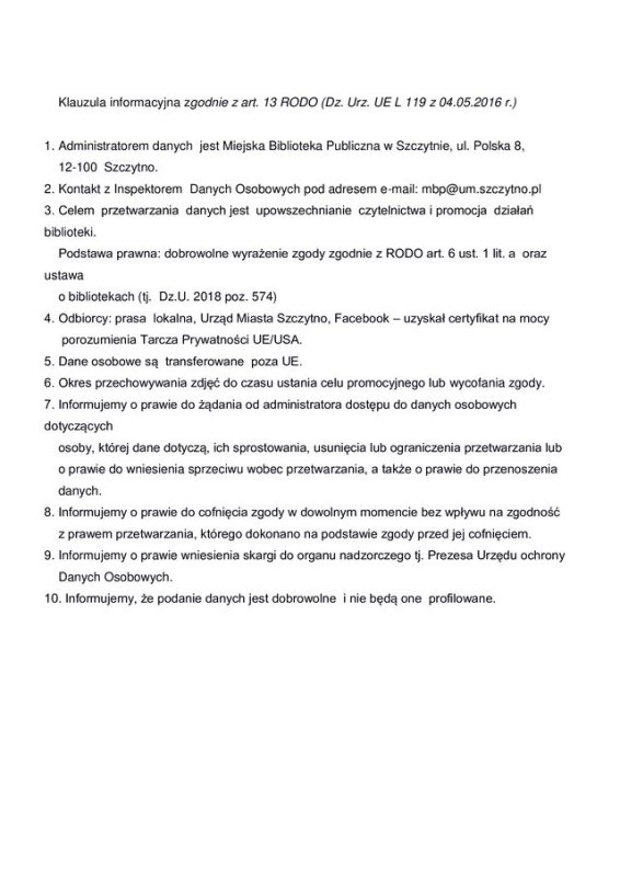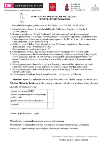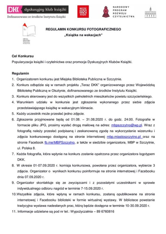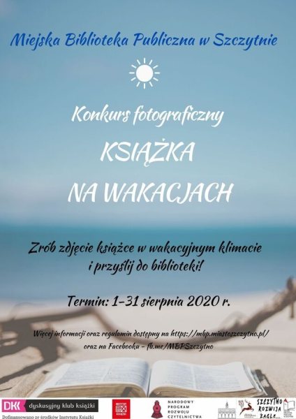 Miejska Biblioteka Publiczna w Szczytnie zaprasza do udziału w konkursie fotograficznym „Książka na wakacjach", który odbędzie się w ramach projektu „Teraz DKK” organizowanego przez Wojewódzką Bibliotekę Publiczną w Olsztynie, dofinansowanego ze środków Instytutu Książki.