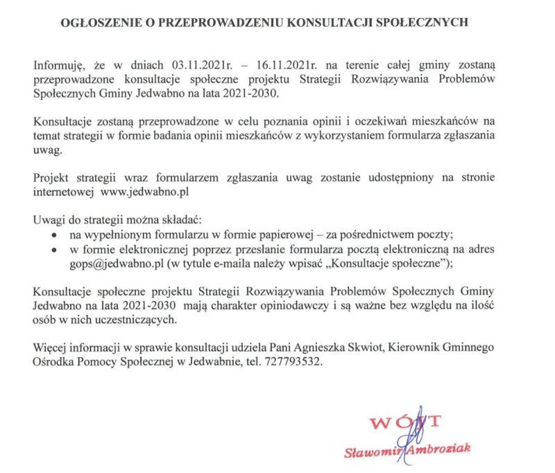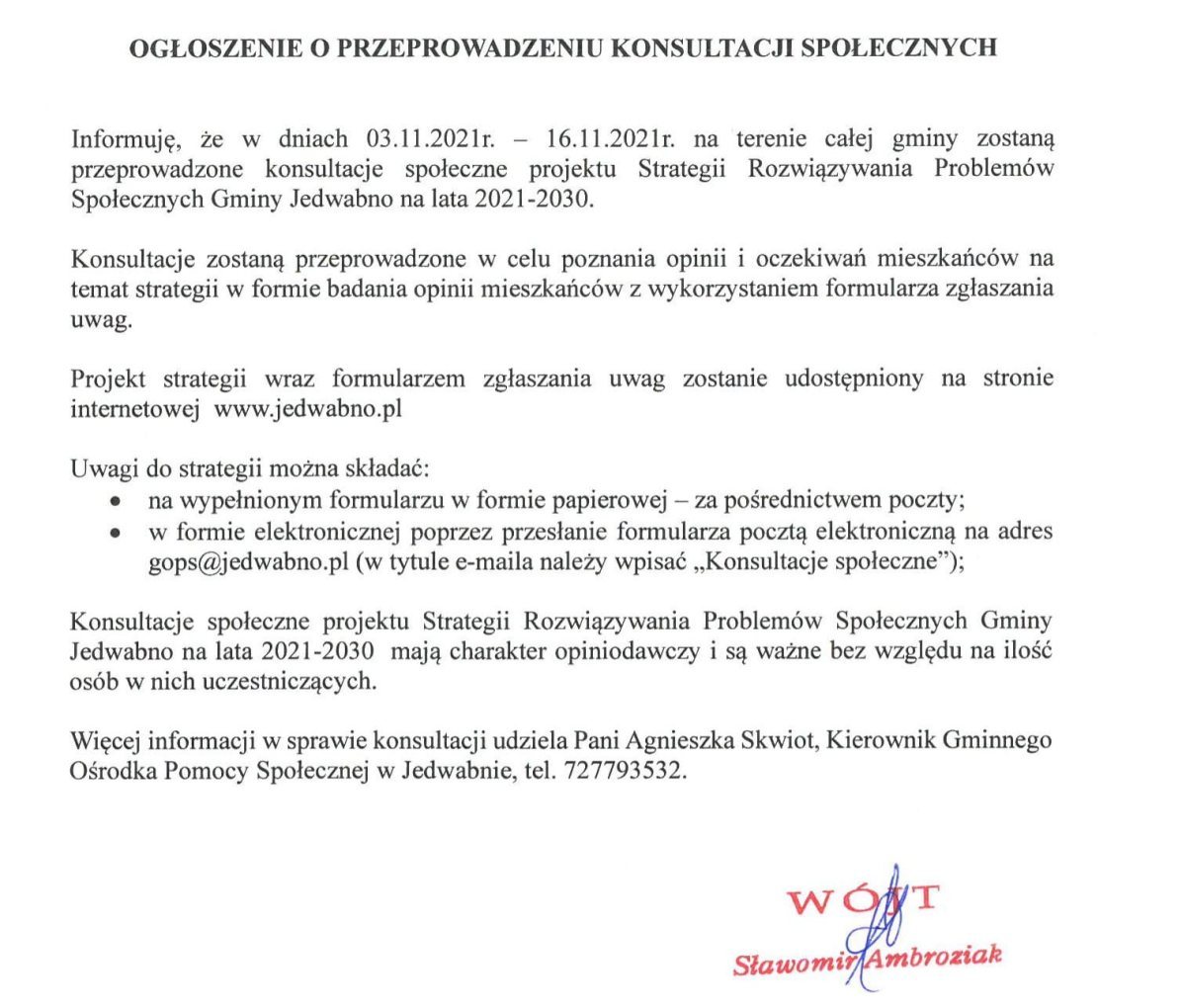 Uwagi można wysyłać drogą elektroniczną na adres mailowy: gops@jedwabno.p z tytułem maila "Konsultacje społeczne".