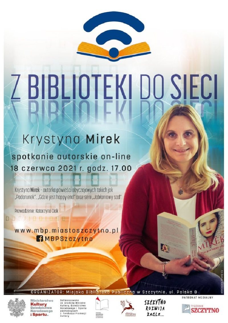 Miejska Biblioteka Publiczna w Szczytnie zaprasza na kolejne z cyklu spotkań autorskich realizowanych w ramach projektu „Z biblioteki do sieci”. 18 czerwca o godz. 17.00 na żywo połączy się z nami Krystyna Mirek - autorka powieści obyczajowych takich jak "Podarunek", "Gdzie jest happy end" oraz serii "Jabłoniowy sad".