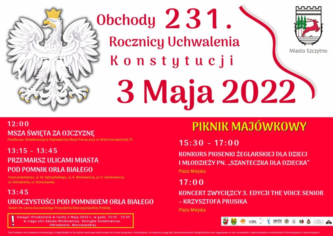 Wyjątkowo atrakcyjnie zapowiada się 3 maja w Szczytnie. Oprócz uroczystości państwowych i samorządowych z okazji 231. rocznicy uchwalanie Konstytucji 3 Maja zaplanowano też szereg wydarzeń kulturalnych, w tym konkurs piosenki żeglarskiej, czy występ Krzysztofa Prusika, zwycięzcy trzeciej edycji Voice Senior. Szczegóły na plakatach. Polecamy. Wstęp wolny.