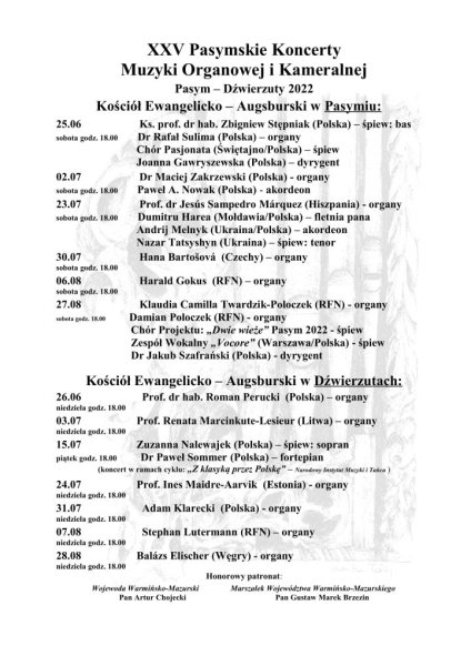 W sobotę, 25 czerwca startują XXV Koncerty Muzyki Organowej i Kameralnej w Pasymiu i Dźwierzutach. Pierwszy koncert odbędzie się w Pasymiu, w kościele ewangelicko–augsburskim. Będzie można posłuchać i zobaczyć ks. prof. doktora hab. Zbigniewa Stępniaka (Olsztyn/Polska) – śpiew: bas, doktora Rafała Sulimę (Polska) – organy, Chór Pasjonata (Szczytno/Polska) – śpiew Joanna Gawryszewska – dyrygent.