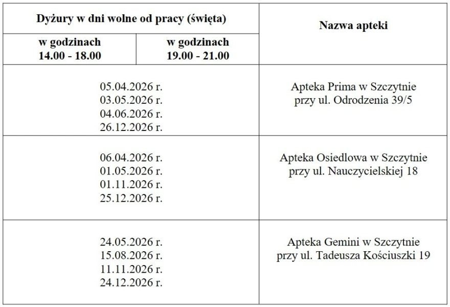 W dni świąteczne apteki będą czynne w dwóch przedziałach czasowych: od 14.00 do 18.00 oraz od 19.00 do 21.00. Dyżury przypisano do konkretnych dat.