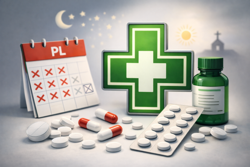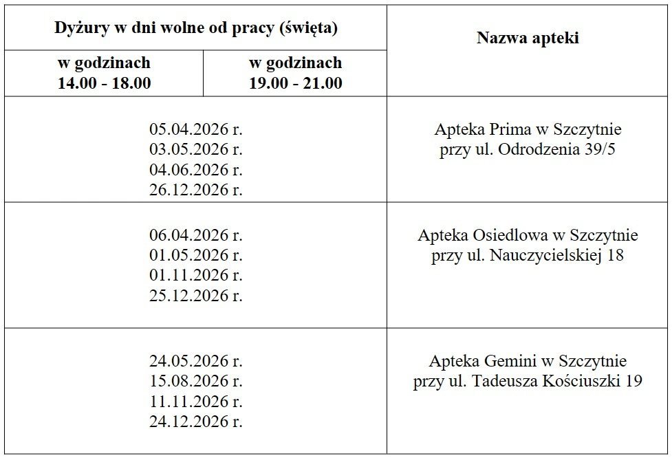 Jeśli w święta albo późnym wieczorem potrzebujesz leków, warto wiedzieć, dokąd jechać. Zarząd Powiatu w Szczytnie przyjął harmonogram dyżurów aptek na 2026 rok. Trzy placówki będą pełnić dyżury rotacyjnie w dni wolne od pracy oraz w porze nocnej.