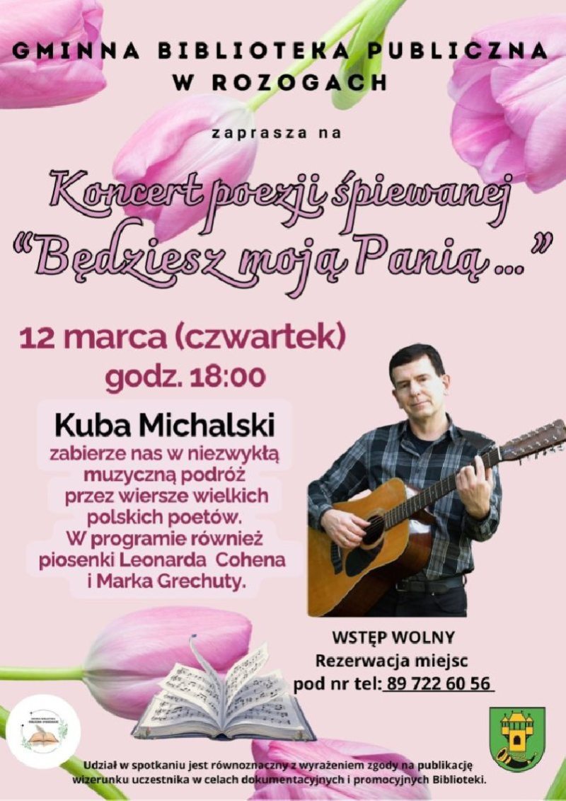 Gminna Biblioteka Publiczna w Rozogach zaprasza na koncert poezji śpiewanej „Będziesz moją Panią…”. W czwartek 12 marca o godz. 18.00 wystąpi Kuba Michalski. Wstęp jest wolny, obowiązuje rezerwacja miejsc.