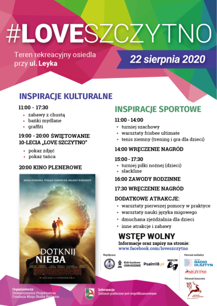 Ciekawym punktem programu będzie warsztat nauki języka migowego, który przeprowadzimy po raz pierwszy. Wydarzenie będzie wyjątkowe nie tylko ze względu na jubileusz, ale także sytuację związaną z koronawirusem. To oznacza pewne ograniczenia, którym mimo to próbujemy przeciwdziałać. Jubileusz Love Szczytno chcemy zaakcentować specjalnym pokazem zdjęć przedstawiających historię wydarzenia oraz pokazem tańca. Po nim zapraszamy na seans kina plenerowego, w którym można będzie zobaczyć wyjątkowy i inspirujący film „Dotknij Nieba”. Staramy się więc o to, by nie zabrakło atrakcyjnych elementów. W związku z koronawirusem prosimy tylko uczestników o to, by przestrzegali podstawowych zasad bezpieczeństwa.