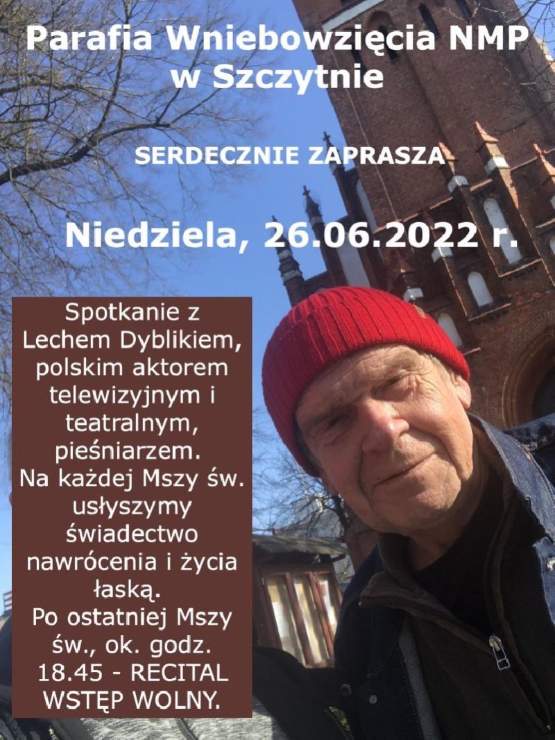 Lech Dyblik – znany polski aktor telewizyjny i teatralny, pieśniarz odwiedzi Szczytno. Przyjedzie do naszego miasta w niedzielę, 26 czerwca. Przyjął zaproszenie proboszcza parafii Wniebowzięcia Najświętszej Maryi Panny w Szczytnie księdza Andrzeja Adamczyka.