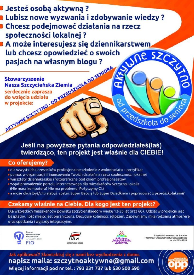 „Od przedszkola do seniora” - to już drugie przedsięwzięcie stowarzyszenia NSZ, finansowane ze środków FIO. Ma trwać do listopada bieżącego roku, a obecnie trwa już rekrutacja jego uczestników. Zgłoszenia są przyjmowane drogą mailową (szczytnoaktywne@gmail.com) oraz telefonicznie: 793 231 737 lub 530 500 590.