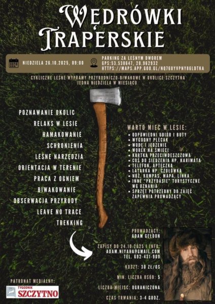 Nie ma GPS-a, który poprowadzi przez zapach mokrej ściółki i dźwięk trzaskającego drewna. Dlatego w niedzilę, 26 października o 9:00 leśny parking za Leśnym Dworem znów zamieni się w punkt zbiórki ludzi, którzy zamiast galerii handlowych wybierają szelest liści i zapach dymu z ogniska. Rusza szósta odsłona cyklu „Wędrówki Traperskie”, na którą zaprasza Adam Gełdon.