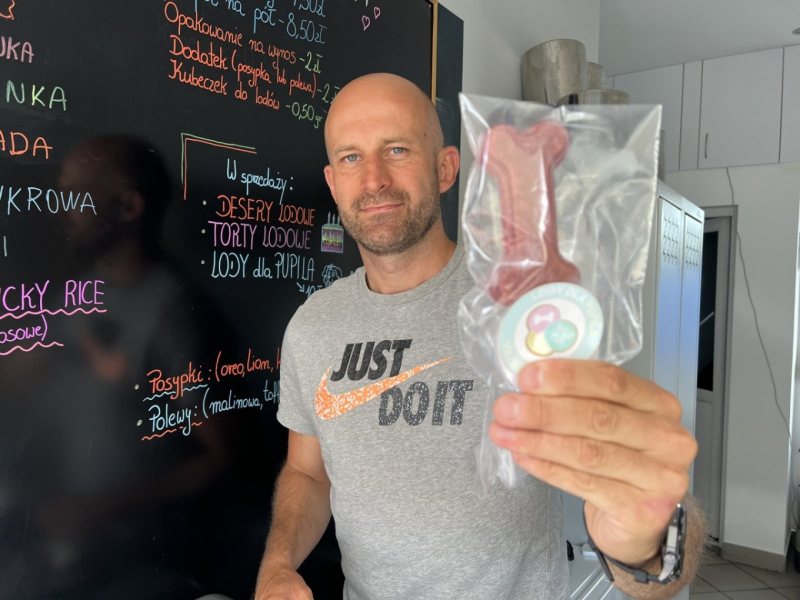 – Wprowadziliśmy lody dla psów – mówi właściciel. – To trzy smaki: kaczka, indyk i wołowina. Na patyku, w folii, głęboko mrożone. Aż 80% mięsa – skład, który zadowoli nawet najbardziej wybrednego pupila.