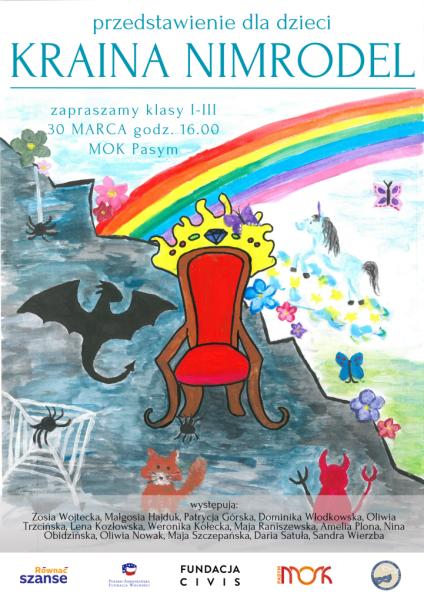 Miejski Ośrodek Kultury w Pasymiu zaprasza wszystkie dzieci z klas I-III na niezwykłe przedstawienie teatralne "KRAINA NIMRODEL", które odbędzie się już w czwartek, 30 marca o godzinie 16.00.