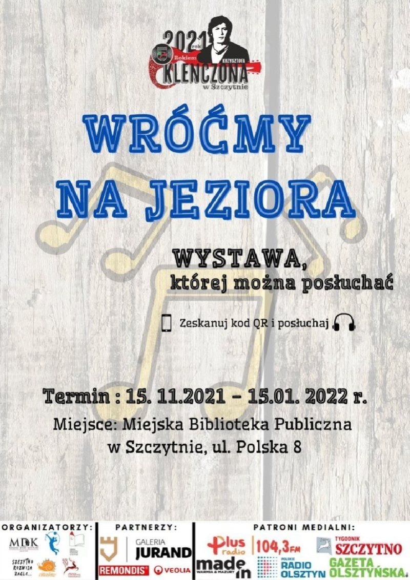 Jeszcze do soboty, 15 stycznia w Miejskiej Bibliotece Publicznej w Szczytnie można oglądać muzyczną wystawę „Wróćmy na jeziora" przygotowaną w ramach Roku Krzysztofa Klenczona w Szczytnie.