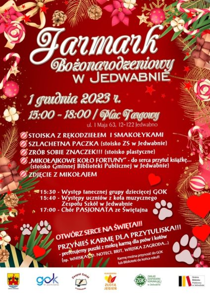 - Zaprezentują się nasi lokalni wystawcy ci bliżsi i dalsi – zachęca do uczestnictwa w wydarzaniu Adam Cudak, dyrektor GOK w Jedwabnie. - Myślę, że będzie to dobra okazja, by zakupić jakiś stroik, czy inną ozdobę świąteczną. W części artystycznej zaprezentuje się Chór Pasjonata ze Świętajna oraz uczuciowe z naszego zespołu szkół, a także uczestnicy zajęć tanecznych działających w naszym GOK – dodaje. - Tradycyjnie podczas jarmarku będzie też zbierana karma dla zwierząt z naszego przytuliska. Jeśli ktoś chciałby wspomóż zwierzęta w tym trudnym dla nich okresie to będzie nam ogromnie miło. Widzimy się 1 grudnia na placu targowym w Jedwabnie.