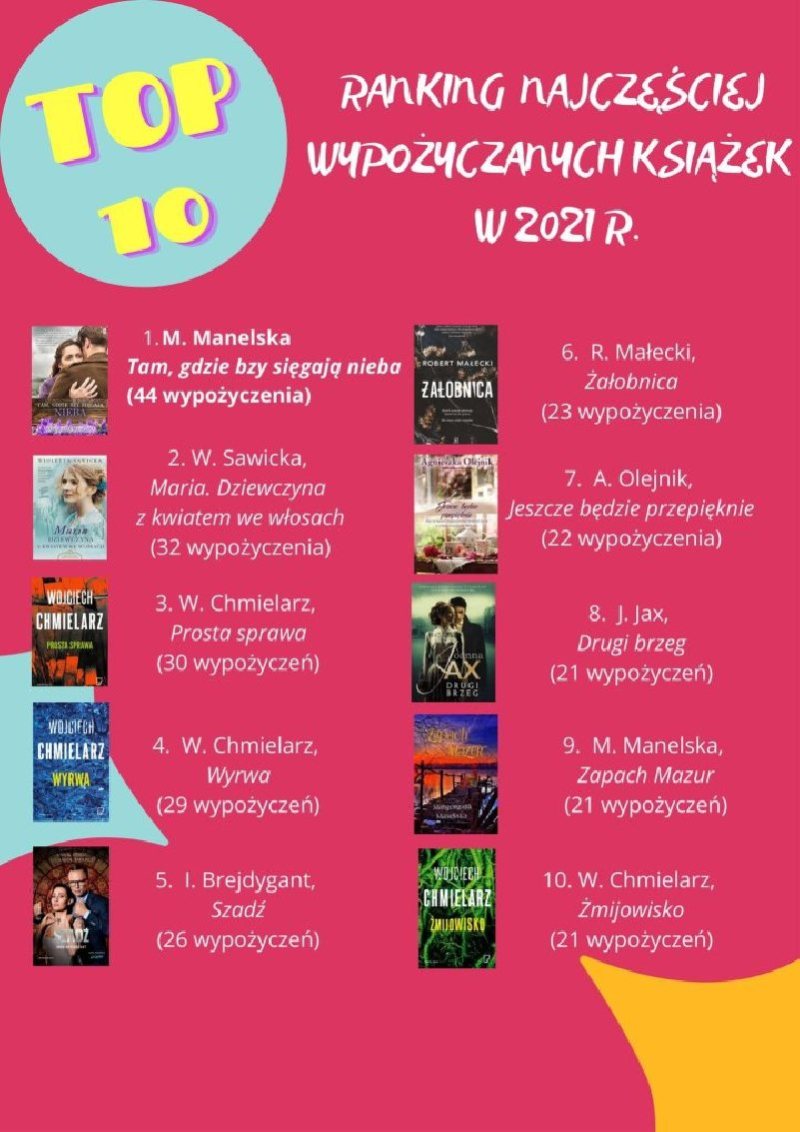 Książka pani Małgorzaty została wypożyczona 44 razy. Na drugim miejscu, z 32 wypożyczeniami” uplasowała się „Maria. Dziewczyna z kwiatem we włosach” Wioletty Sawickiej, a na trzecim „Prosta Sprawa” Wojciecha Chmielarza (30 wypożyczeń).