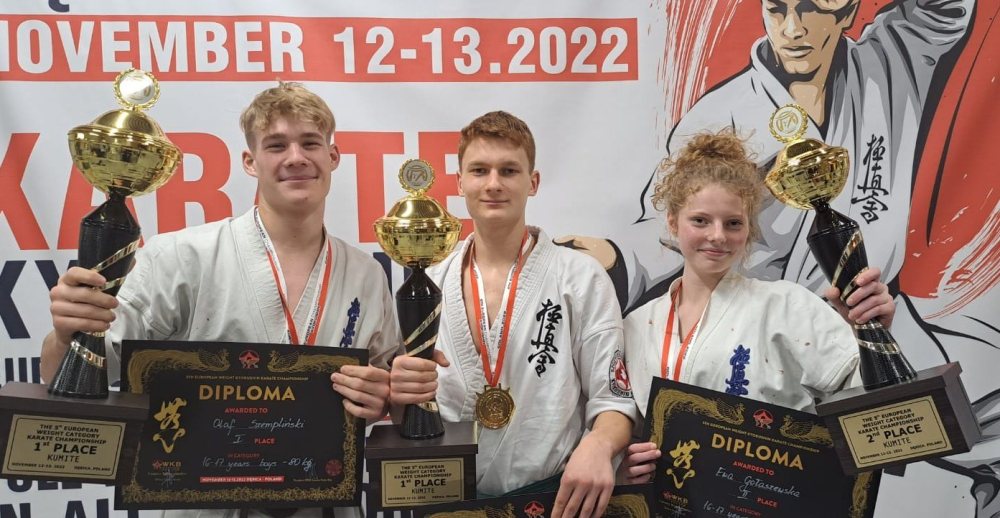 Dziś w Dębicy zakończyły się 5. Mistrzostwa Europy Karate WKB. Nasi medaliści to juniorzy w wieku od 16 do 17 lat. Na co dzień trenują w Szczycieńskim Klubie Kyokushin Karate, którego prezesem jest shihan Piotr Zembrzuski. Olaf walczył w kategorii 80 kg, Jan do 70 kg, a Ewa do 60 kg.