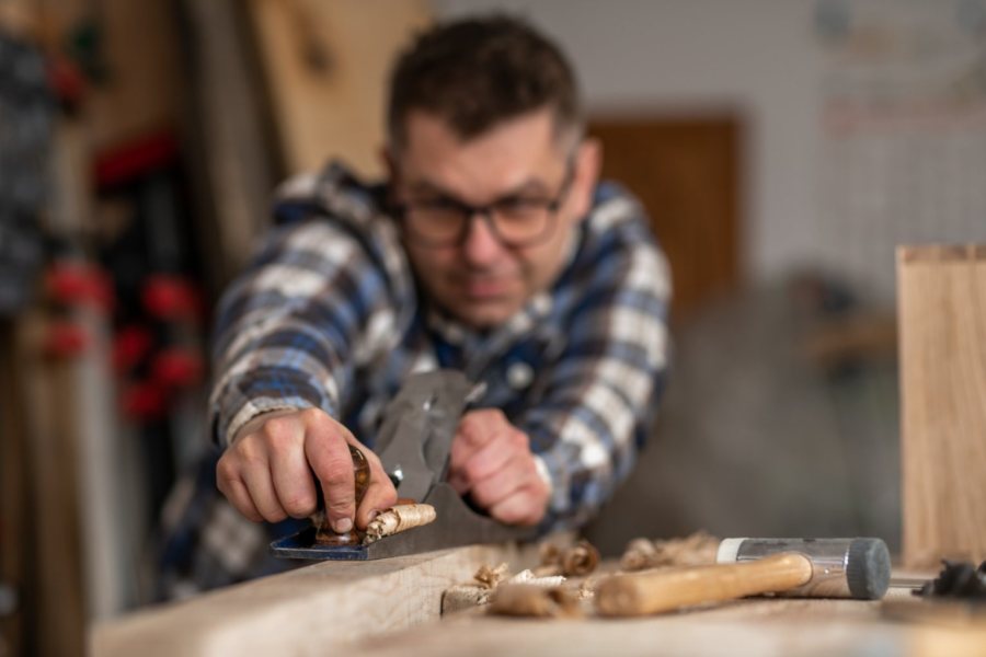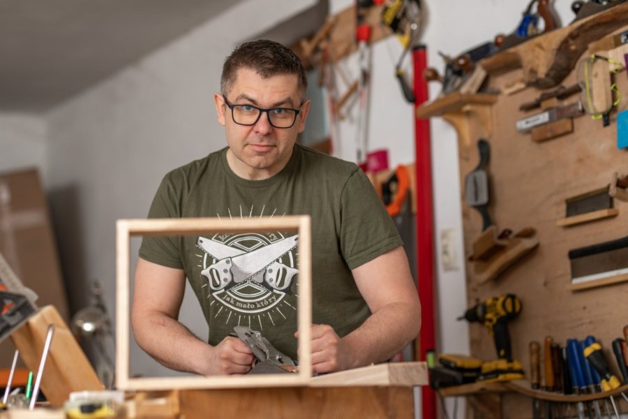 (śmiech) Byłem takim weekendowym wojownikiem. Tworzyłem wyłącznie w weekendy i wyłącznie dla siebie. Zacząłem bawić się w stolarkę tak w 2018 roku. Zrobiłem sobie najpierw stojak, taki koziołek, bo był mi potrzebny w warsztacie. Fajnie wyszedł. Zacząłem dokupywać narzędzia. Potem powstała strugnica stolarska, przy której powstaje ten artykuł (śmiech). Sam może pan oceni, że wyszła dobrze.