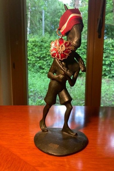 Na fotografii Koziołek Matołek udekorowany przeze mnie medalem „Gloria Artis”. Rzeźba Andrzeja Renesa.