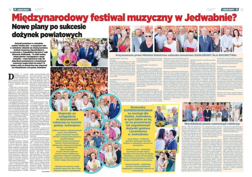Dożynki powiatowe w Jedwabnie wydały właśnie plon – w przyszłym roku w Jedwabnie odbędzie się międzynarodowy festiwal muzyczny. Zapowiedział to w rozmowie z „Tygodnikiem Szczytno” wójt Sławomir Ambroziak. - To efekt analizy święta plonów i wyciągnięcia z niego wniosków – mówi tajemniczo wójt. Na dożynkach powiatowych w szczytowym momencie mogło bawić się nawet 7-8 tysięcy osób, to niemal dwa razy więcej niż ma mieszkańców cała gmina Jedwabno!