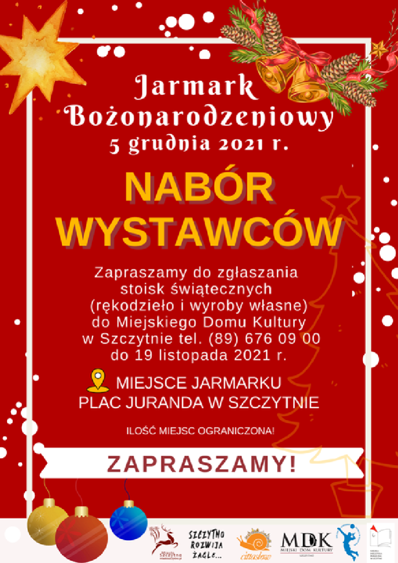 Miejscy urzędnicy rozpoczęli właśnie szukanie wystawców stoisk świątecznych. Chętni mogą zgłaszać się do Miejskiego Domu Kultury w Szczytnie (telefon kontaktowy 89 676 09 00). Termin zgłoszeń upływa 19 listopada.