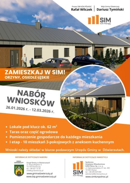 Nabór wniosków potrwa od 26 stycznia do 12 marca 2026 roku. Dokumenty należy składać w biurze podawczym Urzędu Gminy w Dźwierzutach. Szczegółowe informacje dotyczące naboru można uzyskać pod numerem telefonu 89 621 12 32, natomiast informacji o samej inwestycji udziela SIM KZN–Północ pod numerem +48 690 429 850.